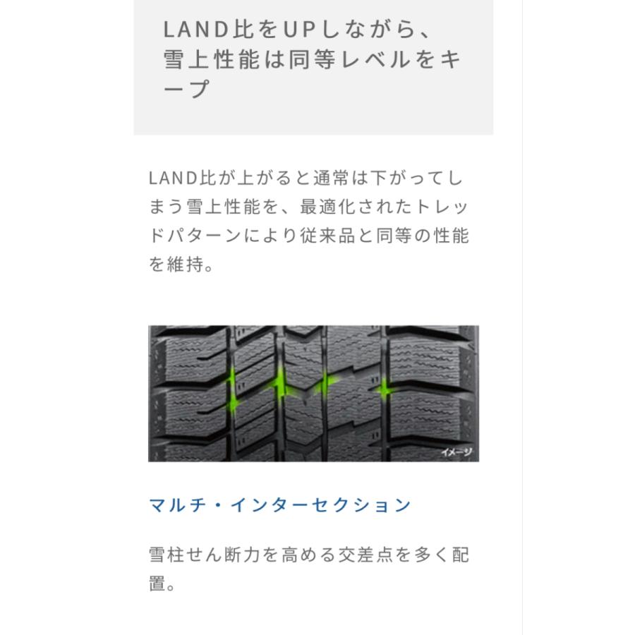 LAND比が上がると通常は下がってしまう雪上性能を、最適化されたトレッドパターンにより従来品と同等の性能を維持することを可能にしました。