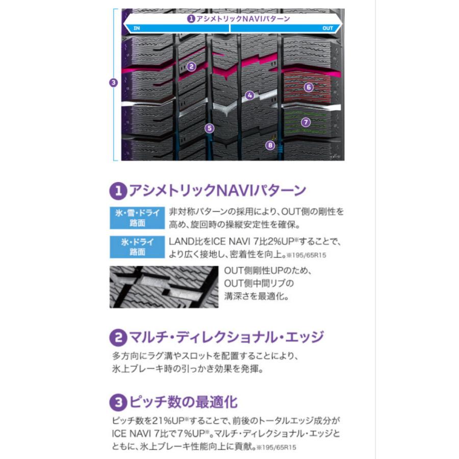 非対称であるアシメトリックNAVIパターンと、ICE NAVI8専用に最適化されたプロファイルによりトレッド部の剛性を高め、優れたハンドリング・操縦安定性を確保していますよ。