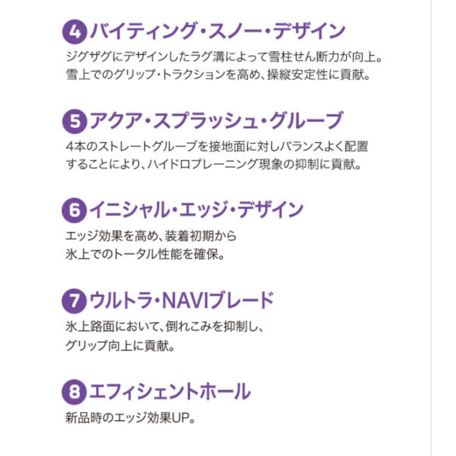 ・エッジ成分の増加と柔軟持続性を高めたコンパウンドにより、従来品(ICE NAVI 7)と比べて氷上ブレーキ性能が8%アップ氷上コーナリング性能が5%アップしています。