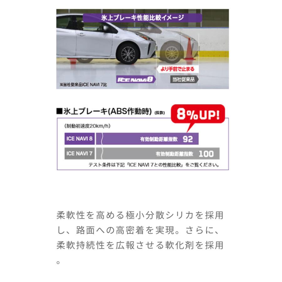 【アイスナビ8】は、コンパウンド(ゴム)に「柔軟持続性を向上させる軟化剤」を採用しており、性能の「効き持ち」が良いとされていますよ。